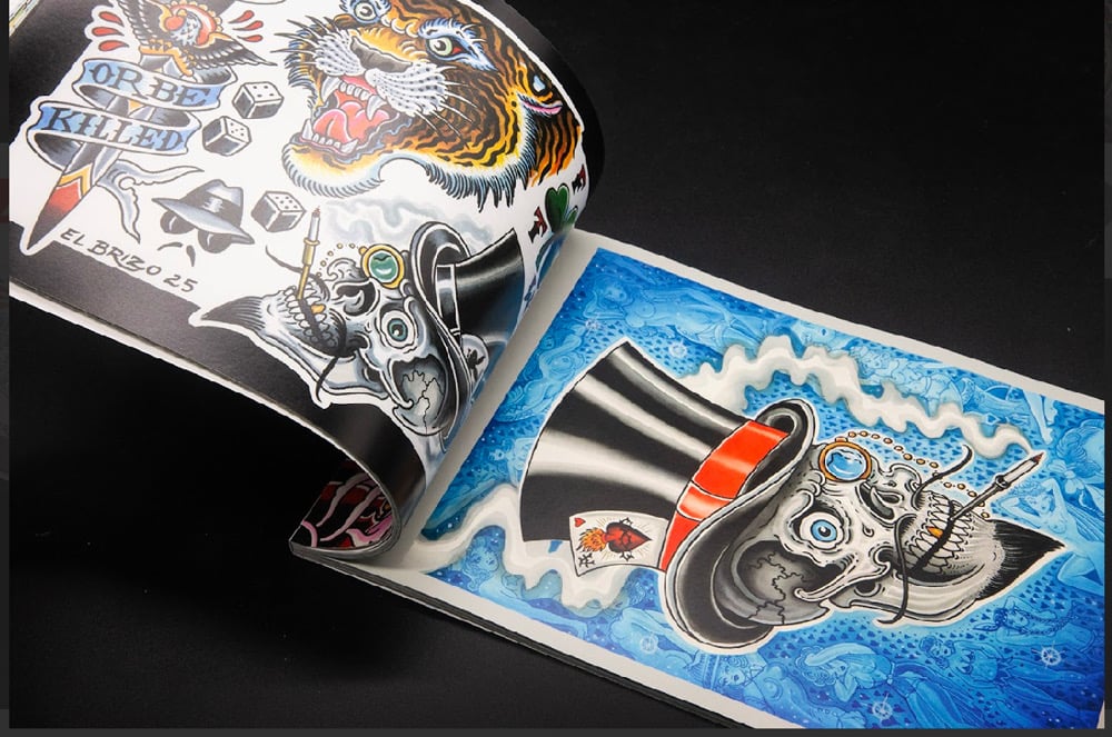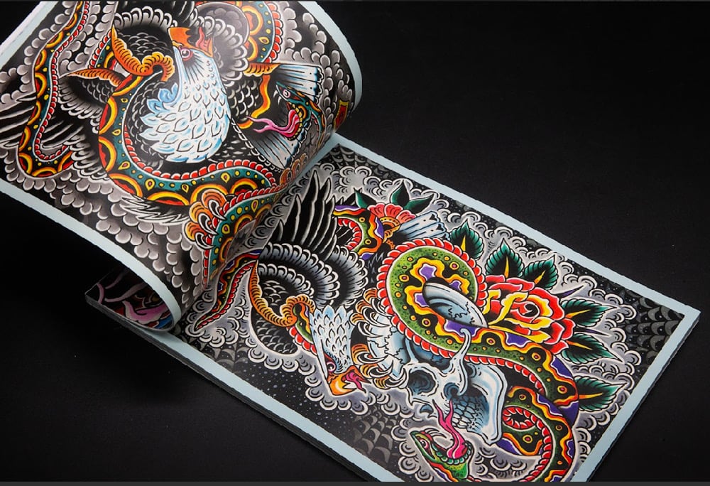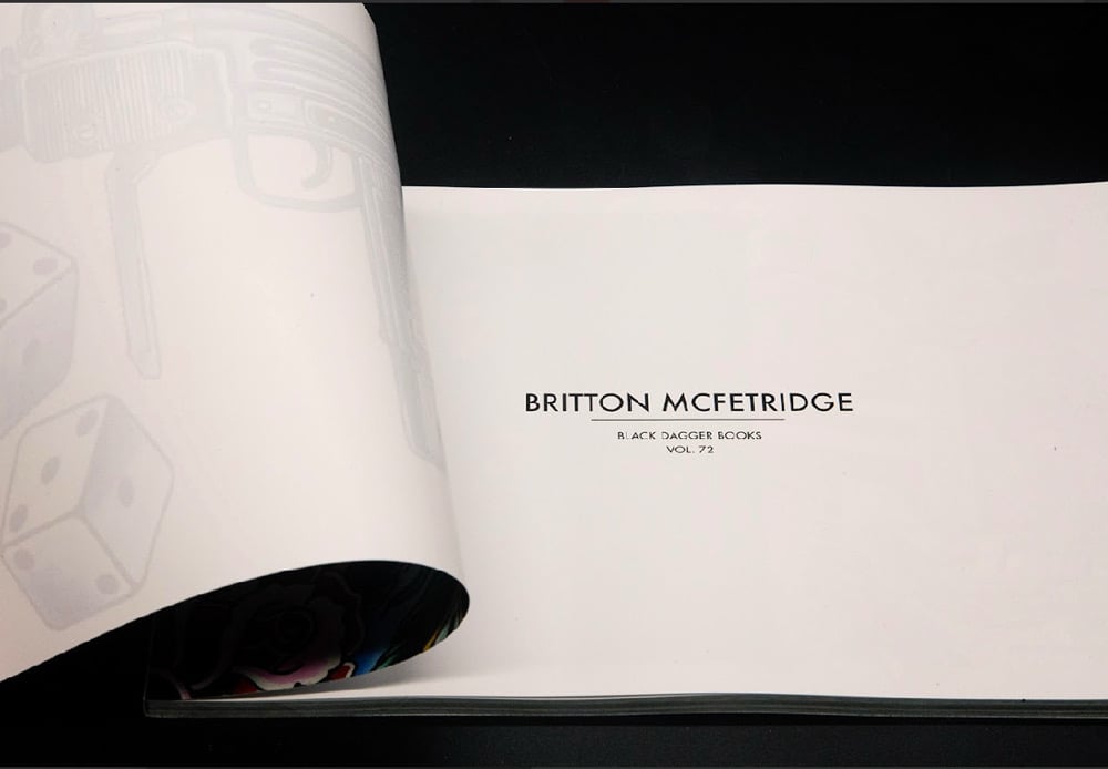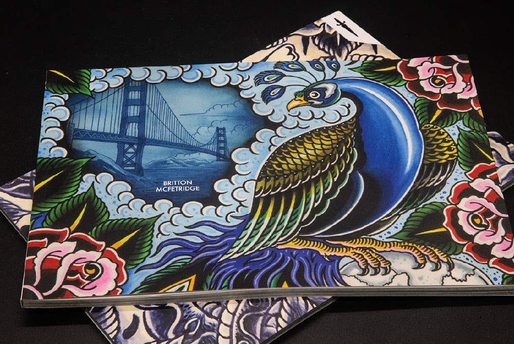 Black Dagger volume number 72. Britton McFetridge. 6”x9” Landscape. 74 pages. Packed full of watercolor paintings, and tattoo ceramic pieces from the last few years. A great reference for American traditional tattooing with a California flair.