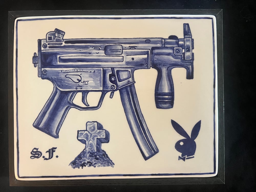 8”x10” hand painted cobalt underglaze ceramic panel with black wood frame
